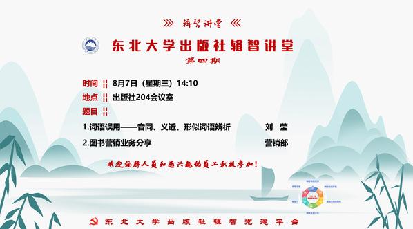 8月7日下午,东北大学出版社在二楼会议室举行辑智讲堂第四期。本期辑智讲堂邀请刘莹老师和营销部刘凯峰老师,分别作编辑业务能力培训和图书营销业务分享。