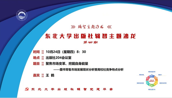 2024年10月24日上午,东北大学出版社在二楼会议室开展辑智主题沙龙第四期,北京开卷信息技术有限公司客户总监王鹤应邀做客本期主题沙龙并作交流分享
